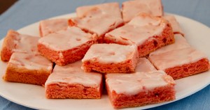 These strawberry brownies are so simple and easy to make and are a pretty pink. As pretty as they are, the brownies are delicious to eat as well. The main ingredient of this recipe is a strawberry cake mix. After the brownies are baked they are topped with a glaze made with powdered sugar and water. I made two batches of the brownies for this post.